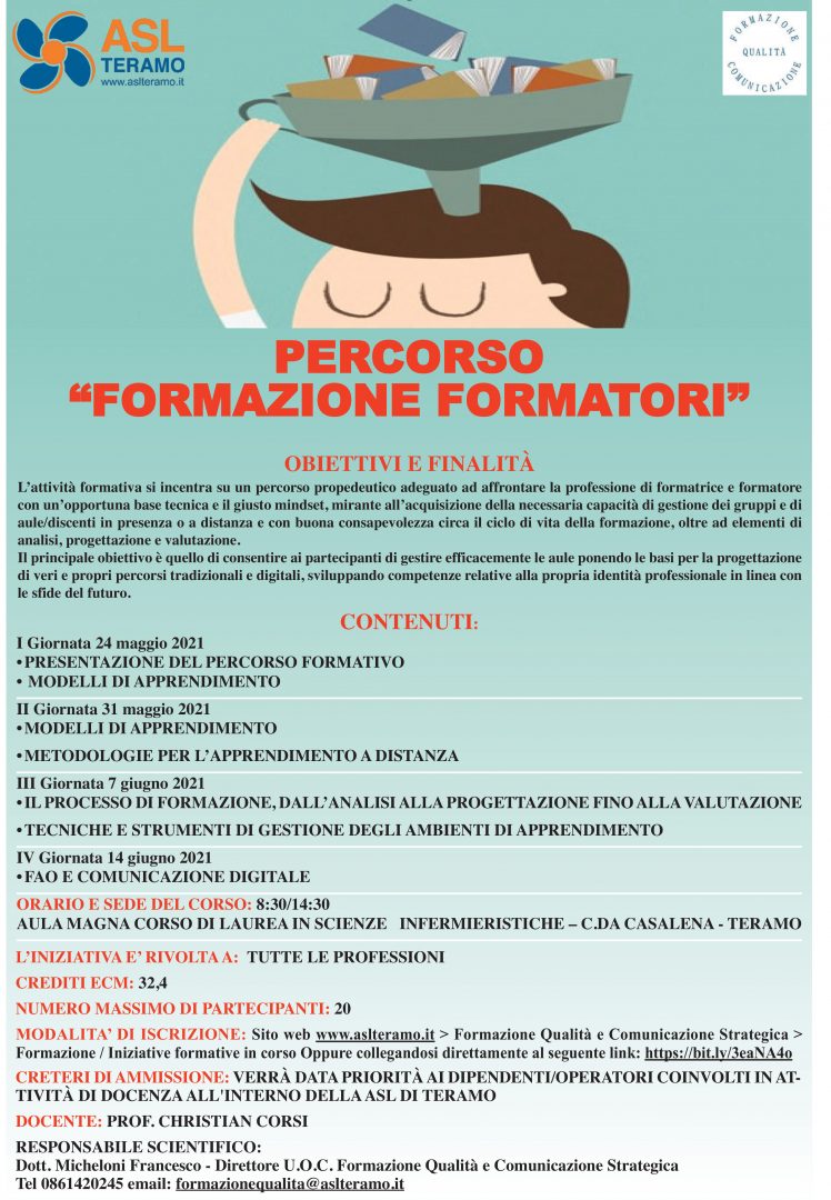 L’INIZIATIVA E’ RIVOLTA A: TUTTE LE PROFESSIONI CREDITI ECM: 32,4 NUMERO MASSIMO DI PARTECIPANTI: 20 MODALITA’ DI ISCRIZIONE: Sito web at.test.udanet.it > Formazione Qualità e Comunicazione Strategica > Formazione / Iniziative formative in corso Oppure […]
