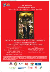 Il Direttore Generale f.f. della ASL di Teramo Maurizio Di Giosia e la Dr.ssa Gabriella Lucidi Pressanti, Direttore del Dipartimento dei Servizi, sono lieti di invitare i cittadini e i pazienti tutti al Concerto Natalizio che si terrà Sabato 21 dicembre p.v. alle ore 18:00, presso la Sala Convegni dell’Ospedale “G. Mazzini” di Teramo.