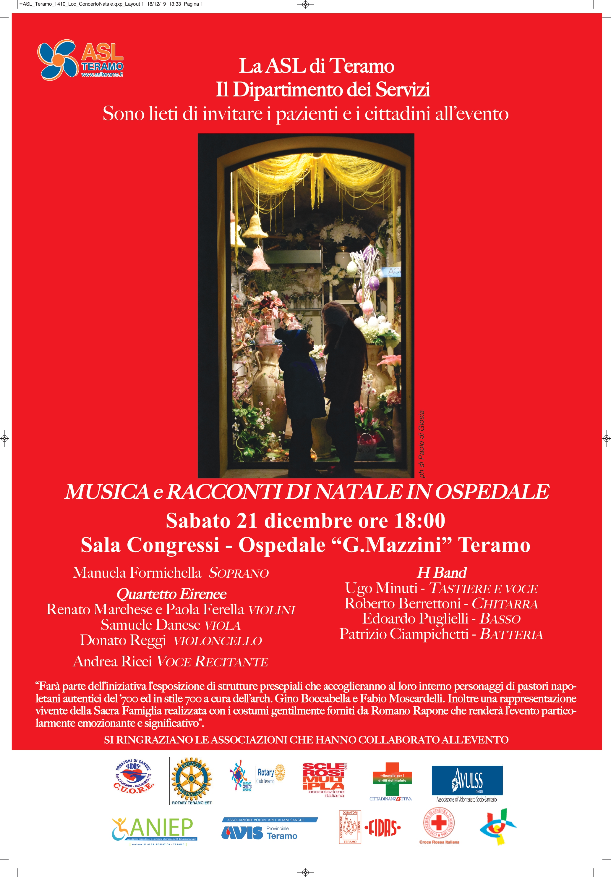 Il Direttore Generale f.f. della ASL di Teramo Maurizio Di Giosia e la Dr.ssa Gabriella Lucidi Pressanti, Direttore del Dipartimento dei Servizi, sono lieti di invitare i cittadini e i pazienti tutti al Concerto Natalizio che si terrà Sabato 21 dicembre p.v. alle ore 18:00, presso la Sala Convegni dell’Ospedale “G. Mazzini” di Teramo.
