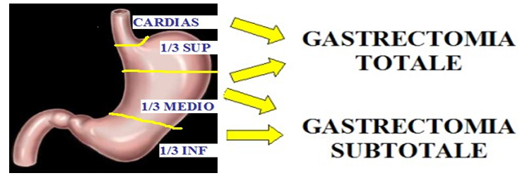 Nel carcinoma gastrico l’estensione della demolizione gastrica è in funzione della sede della neoplasia: se esso è situato a livello del cardias, del fondo e nella parte superiore del corpo è indicata la gastrectomia totale. Se è situato nella parte inferiore del corpo, nell’antro o a livello del piloro è indicata la gastrectomia subtotale. In altre neoplasie (es. GIST) è sufficiente l’asportazione locale, ossia l’asportazione della lesione con ampi margini di tessuto sano.
